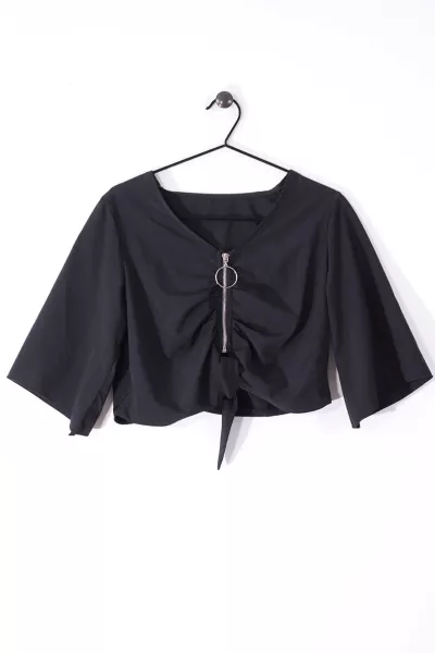 Czarna krótka bluzka ze srebrnym zamkiem i wiązaniem.