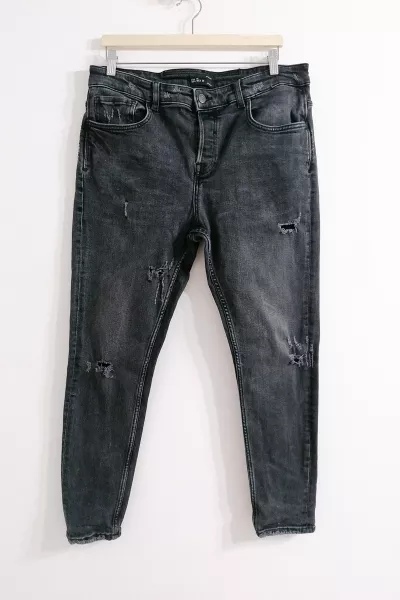 Szare jeansy, dopasowany fason, fabryczne przetarcia