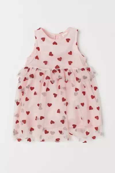 Sukienka bez rękawów z tiulu w brokatowy wzór. Okrągły dekolt, na karku rozcięcie z guzikiem. Góra odcinana z falbankowym brzegiem. Z podszewką.
